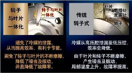從上面的動態(tài)圖可以看出,轉(zhuǎn)子式壓縮機的轉(zhuǎn)子和葉片是分離的,那么在長期的運轉(zhuǎn)下,就容易反復(fù)摩擦,不但容易產(chǎn)生噪音,甚至?xí)斐刹考p和冷媒泄露等問題,可能提升空調(diào)的故障率。