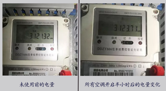 通過很直觀的數據我們可以了解到,開啟所有空調,半小時的耗電量僅為(3123.71-3121.32)-(3121.32- 3121.25)×3=2.18kwh。僅開啟一臺測試空調,半小時耗電量僅為(3124.81-3123.71)-(3121.32- 3121.25)×3=0.89kwh,一小時耗電約為1.78kwh左右。