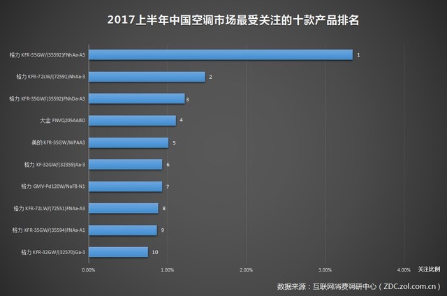 2017上半年我國空調市場最受注重的十款產品排名,在這10款空調單品中,格力居然占有了8款之多!擠進前十的空調單品還有來自