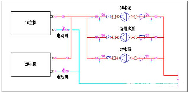 水泵互為備用,循環(huán)水集中后分到需要的每臺(tái)主機(jī),適合做變流量系統(tǒng),節(jié)能效果最好,采用變頻主機(jī)、變頻水泵以及變流量控制系統(tǒng)(如約克VSD,特靈的VPF)之后節(jié)能效果達(dá)到最大。管路交叉相對(duì)較少,有利于主機(jī)房設(shè)計(jì)。很多項(xiàng)目采用此連接方式,在機(jī)房設(shè)計(jì)安裝、運(yùn)行效果和運(yùn)行費(fèi)用控制方面都得到甲方的好評(píng)。